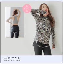 【ラッシュガード/スポーツブラ/パンツ付きレギンス フィットネスセット水着 ランニングウェア スポーツウェア ヨガウェアセット スポーツウェア トレーニングウェア 2分袖 ブラトップ スポーツブラ スポーツブラジャー ヨガパンツ ショットパンツ付きレギンス カップ付き 吸汗速乾 伸縮通気】
