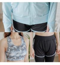 【ラッシュガード/スポーツブラ/パンツ付きレギンス フィットネスセット水着 ランニングウェア スポーツウェア ヨガウェアセット スポーツウェア トレーニングウェア 2分袖 ブラトップ スポーツブラ スポーツブラジャー ヨガパンツ ショットパンツ付きレギンス カップ付き 吸汗速乾 伸縮通気】