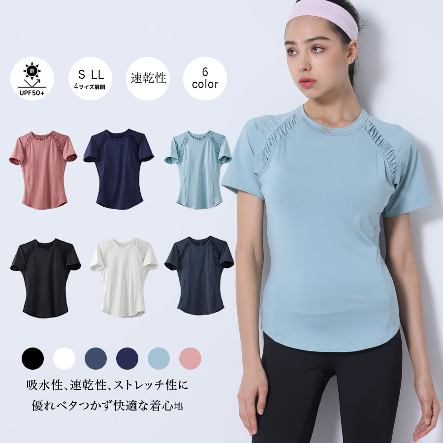 カップ付きヨガ単品Tシャツ Tシャツ レディース 半袖 ストレッチ 吸汗 速乾 スポーツ ナイロン 無地 シャツ ランニング ソフト ヨガ トップス テニス ジム ウェア 透け防止 UVカット 運動着 [YGW20-16]