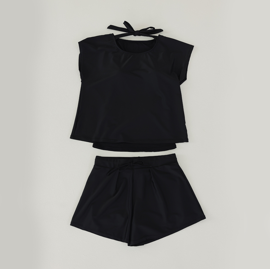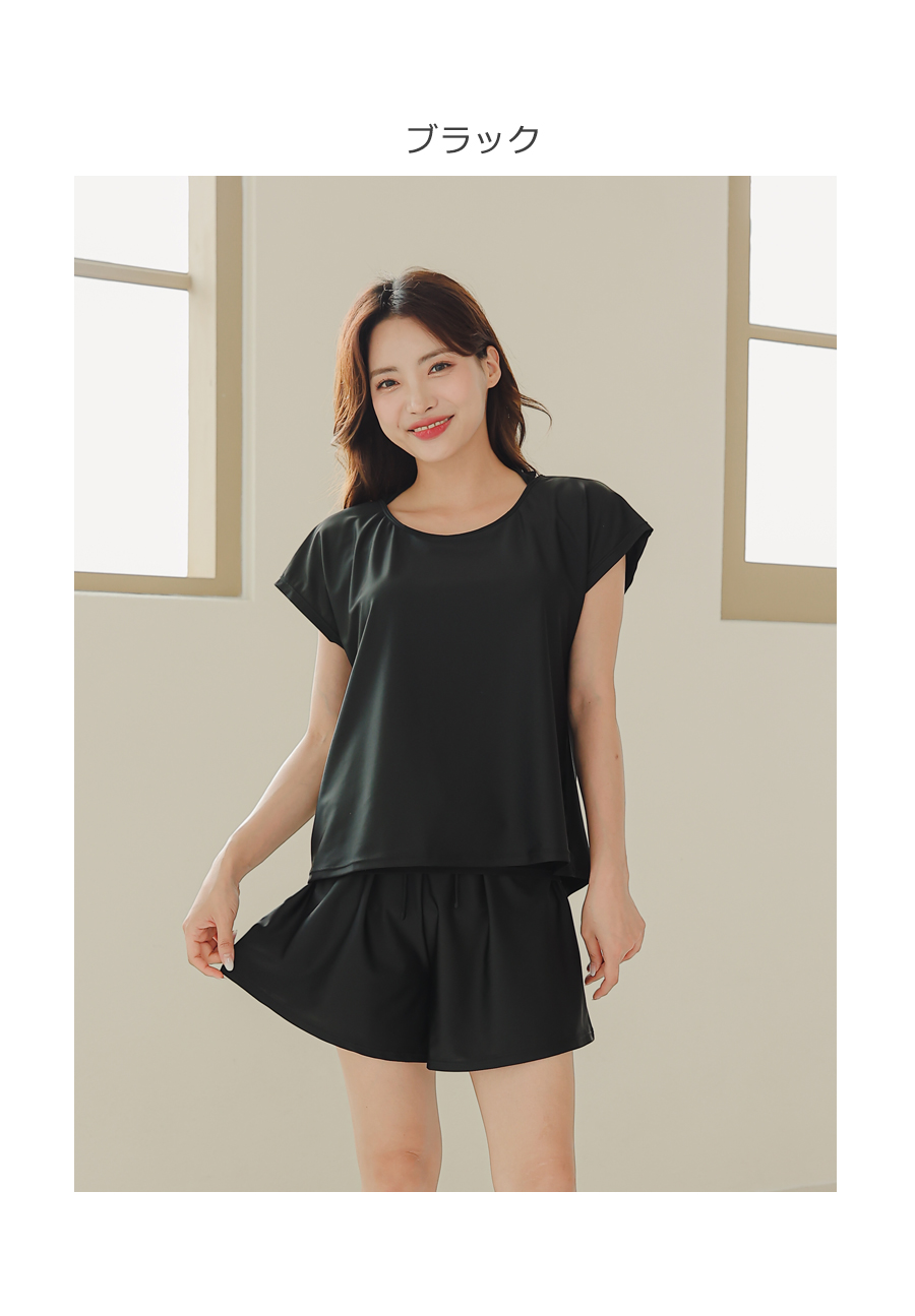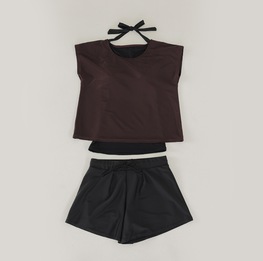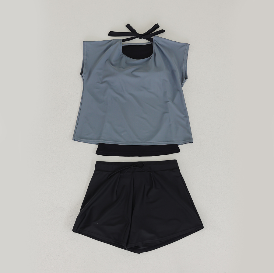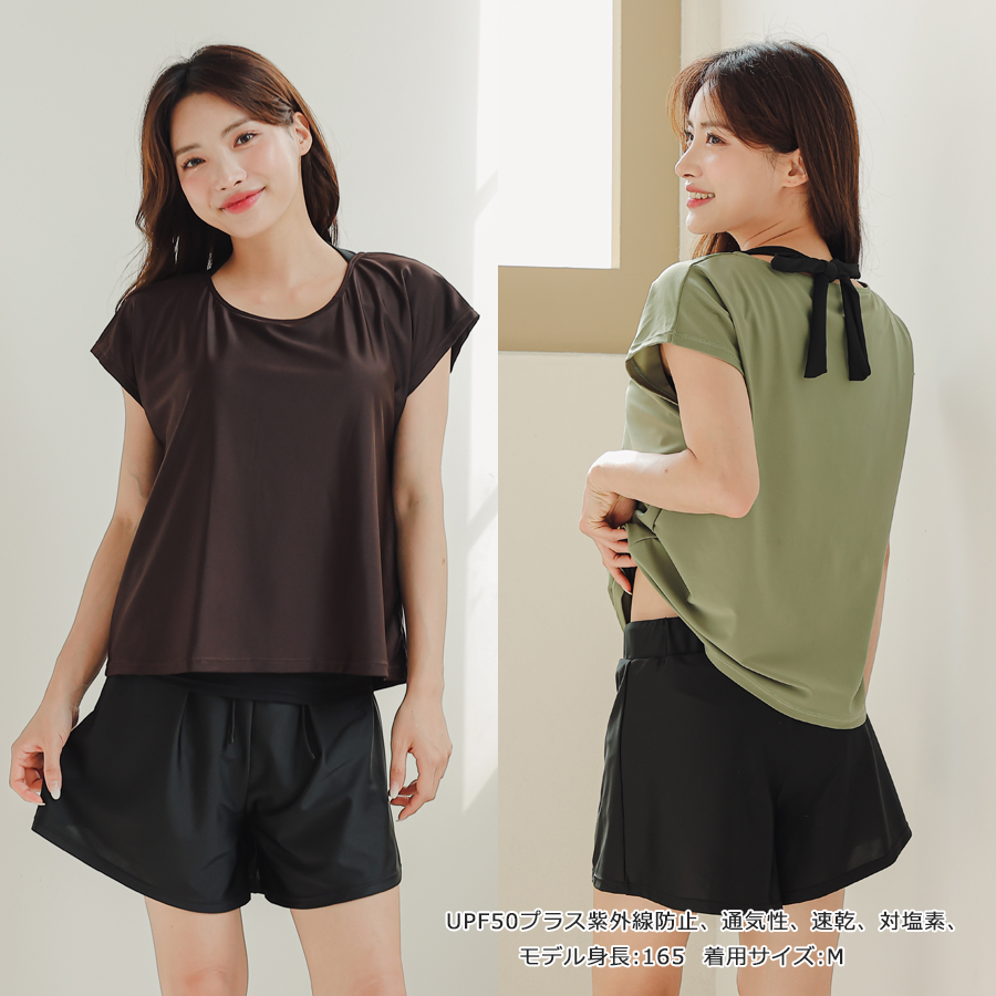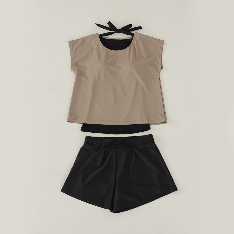 インナータンキニ付き無地袖なしTシャツと インナーパンツ付きショットパンツの二点セット水着