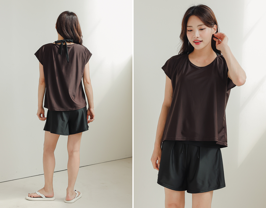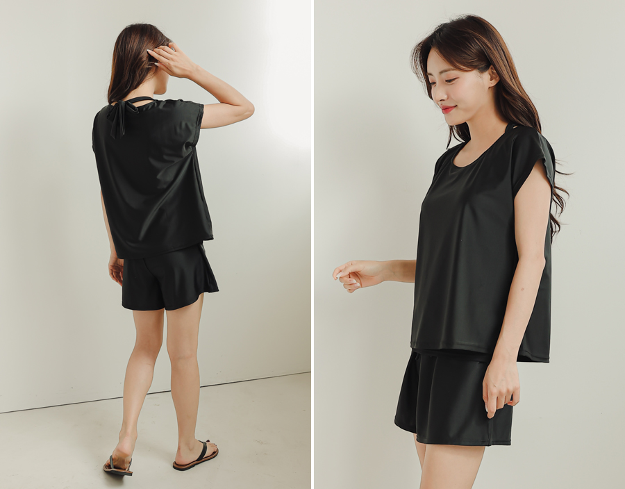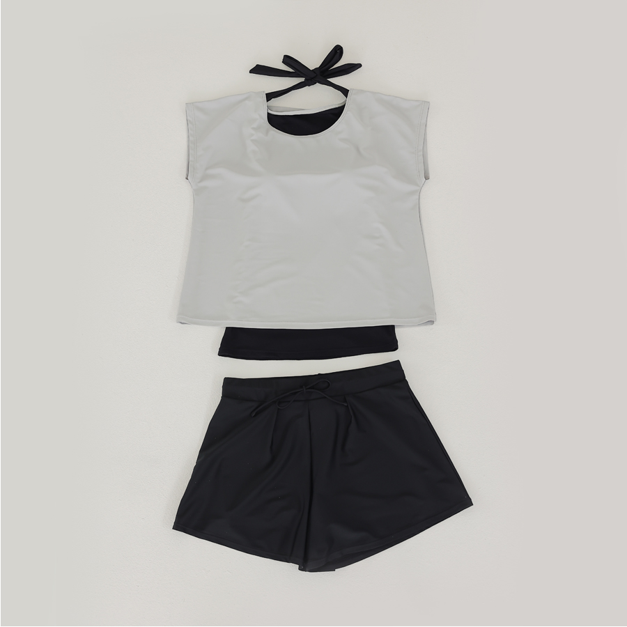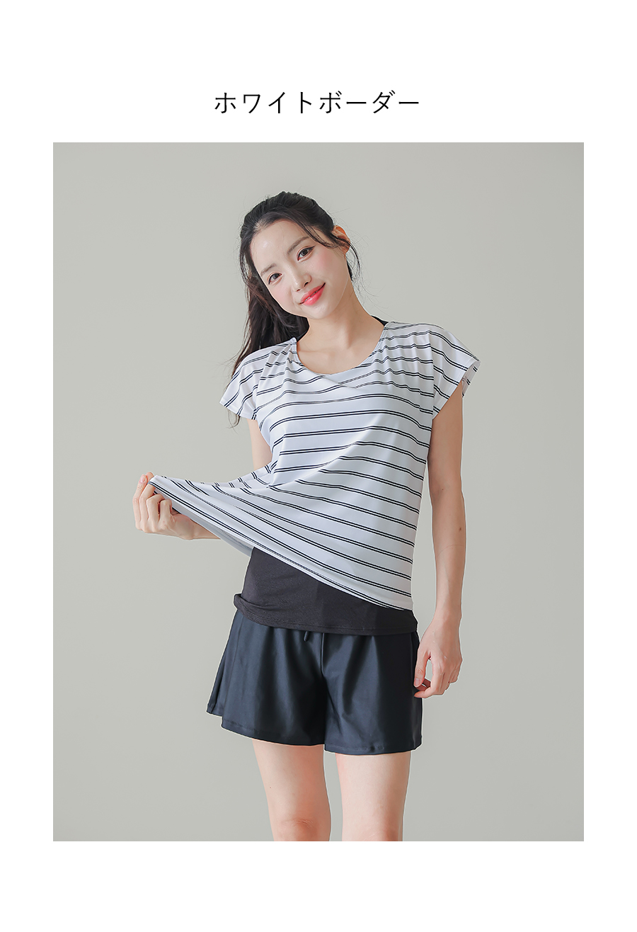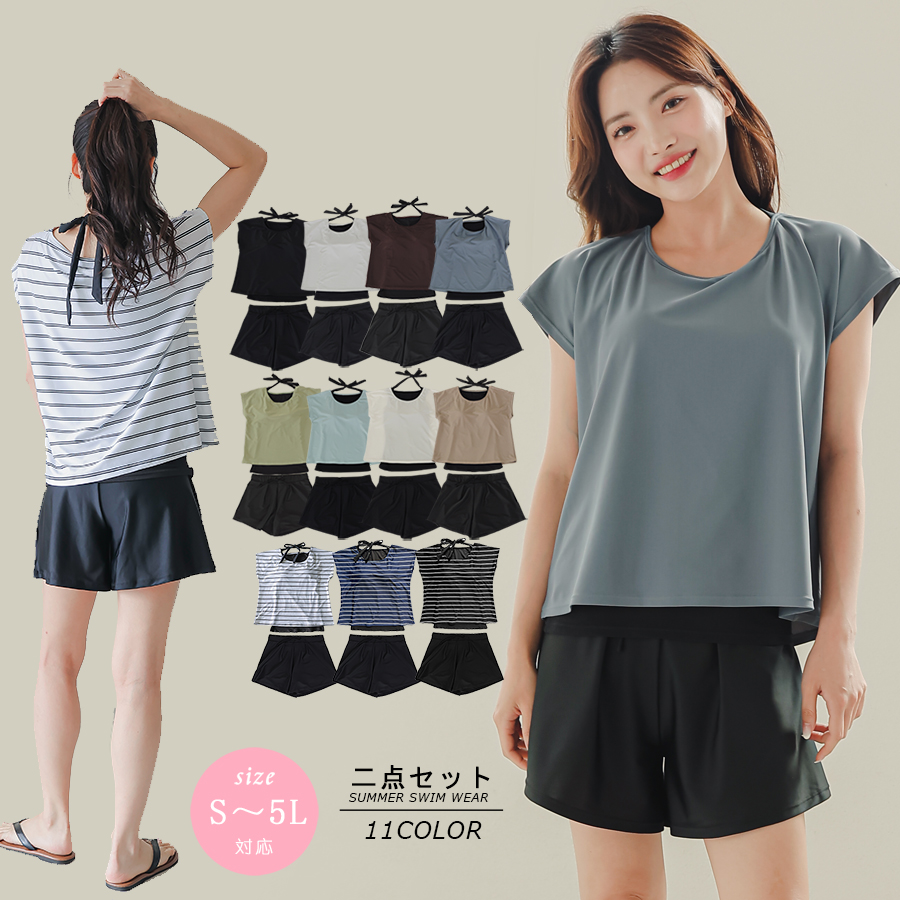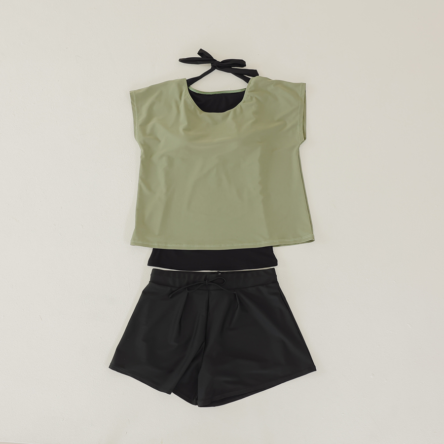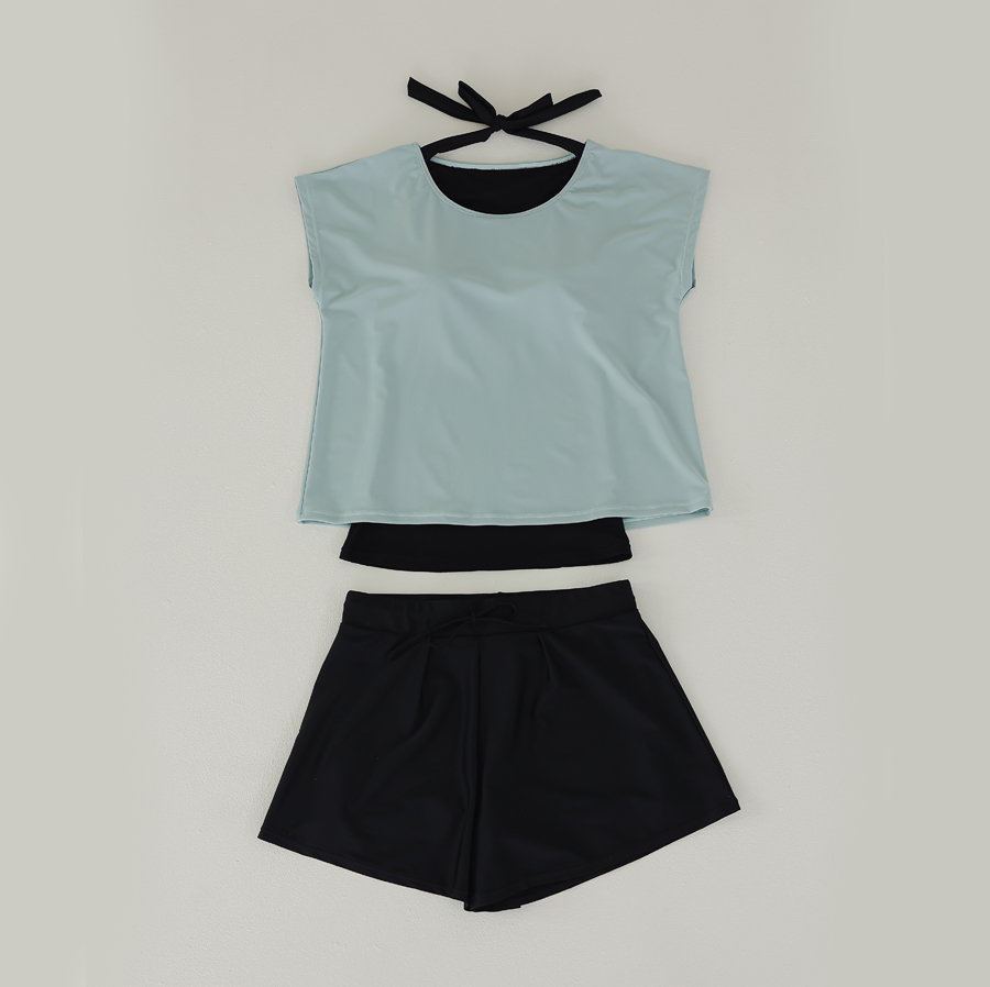 インナータンキニ付き無地袖なしTシャツと インナーパンツ付きショットパンツの二点セット水着