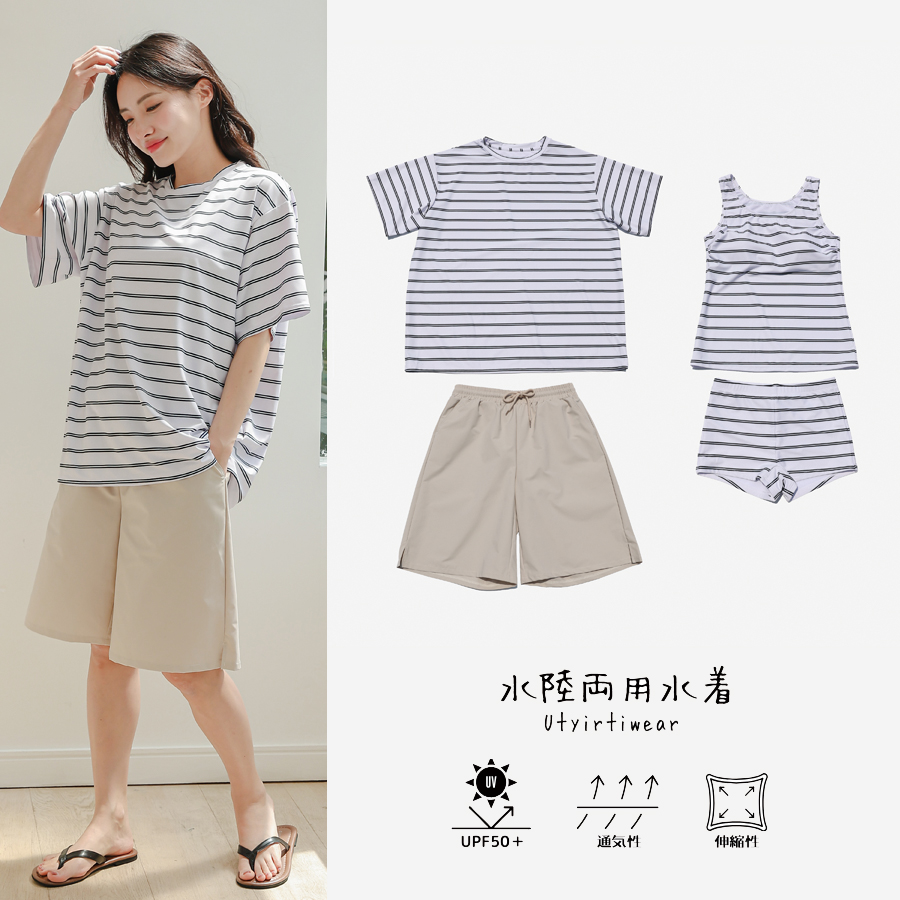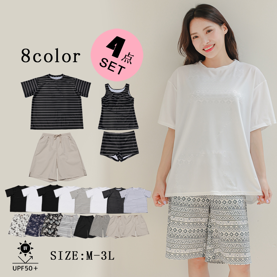 半袖ラッシュガードと膝までロングショットパンツ、タンキニトップス、四角ショーツと水着4点セット