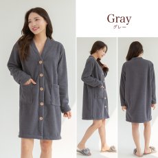 温もりを感じる落ち着いたカラーリングのV首、前ボタン開きのワンピースです。程よいゆったりシルエットのモコモコルームウェア。