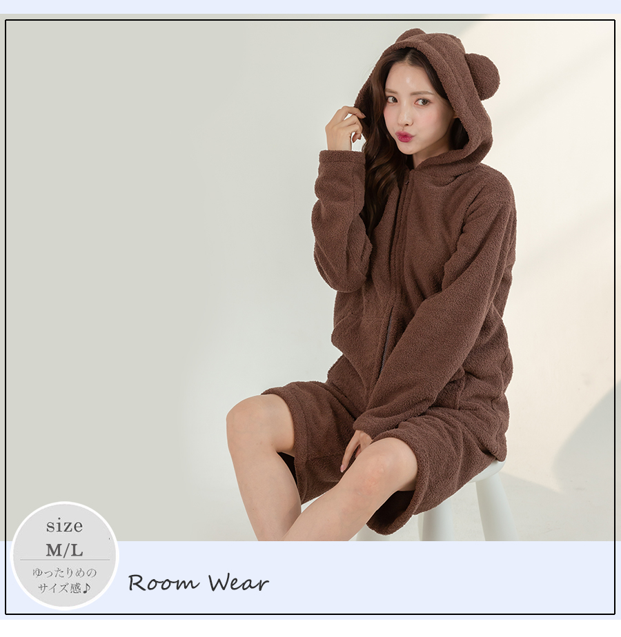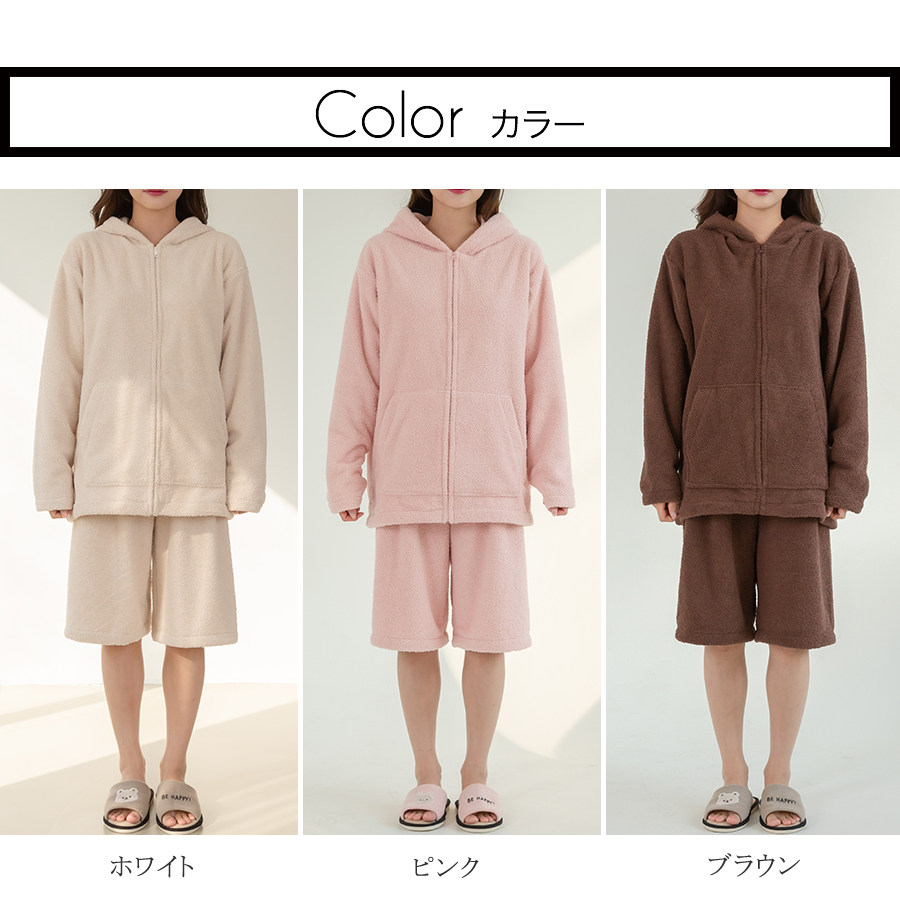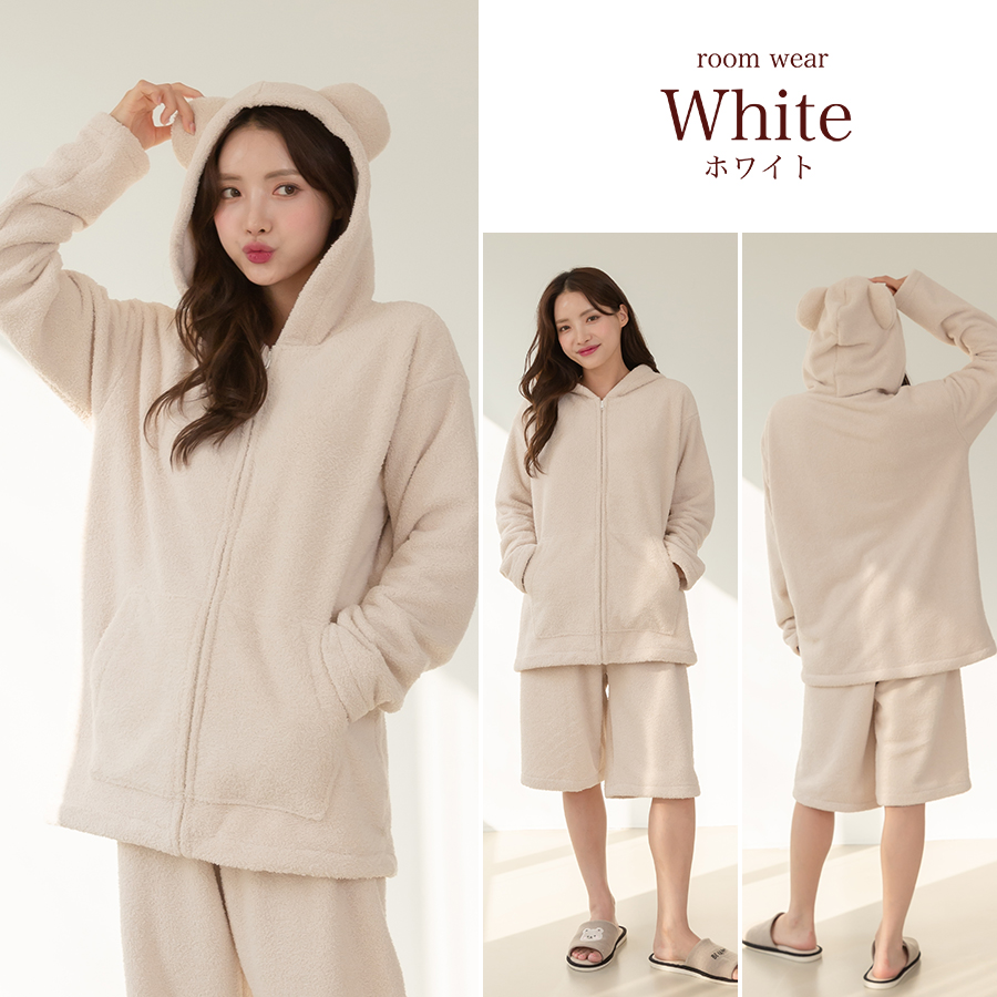 ZIP 猫耳フードパーカーとショットパンツセット 立体的なねこ耳がついたキュートなジップアップフーディーとショートパンツのモコモコルームウェアセット。