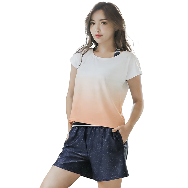 このアイテムはトップス・カバーアップ T シャツ・ショーツ・水着パンツの 4 点がセットになった、使い勝手の良い水着です。