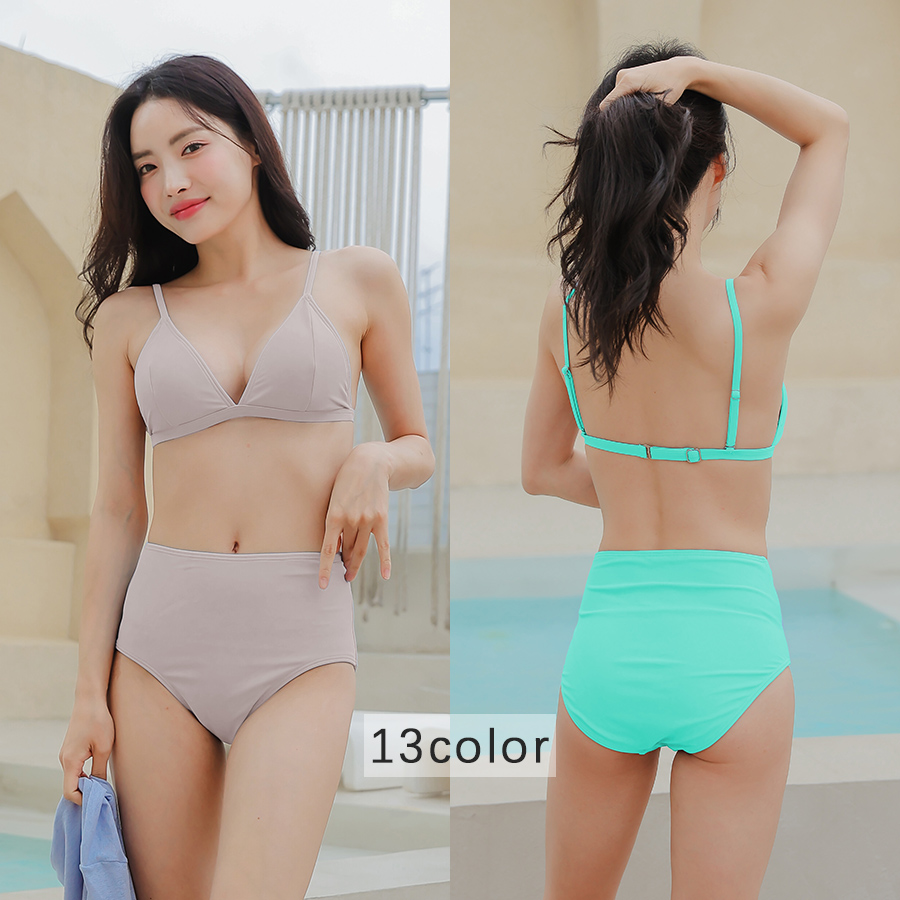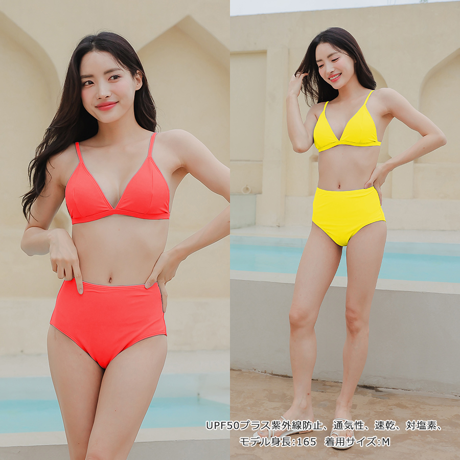 - スタイルアップ効果:ハイウエストボトムがウエストラインを美しく見せ、脚長効果も期待できます。トライアングルトップスはデコルテを美しく演出します。
